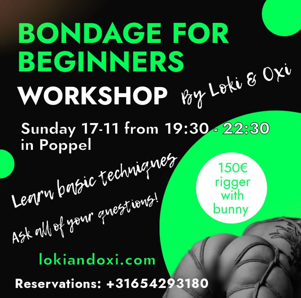 Sunday workshop time! Bondage for beginners workshop at our place. From 19:30-22:30 including drinks, snacks and use of rope. Also possible to buy your own set of ropes. 150€ a couple: a rigger and a bunny (no matter the gender). For reservations contact +31654293180.